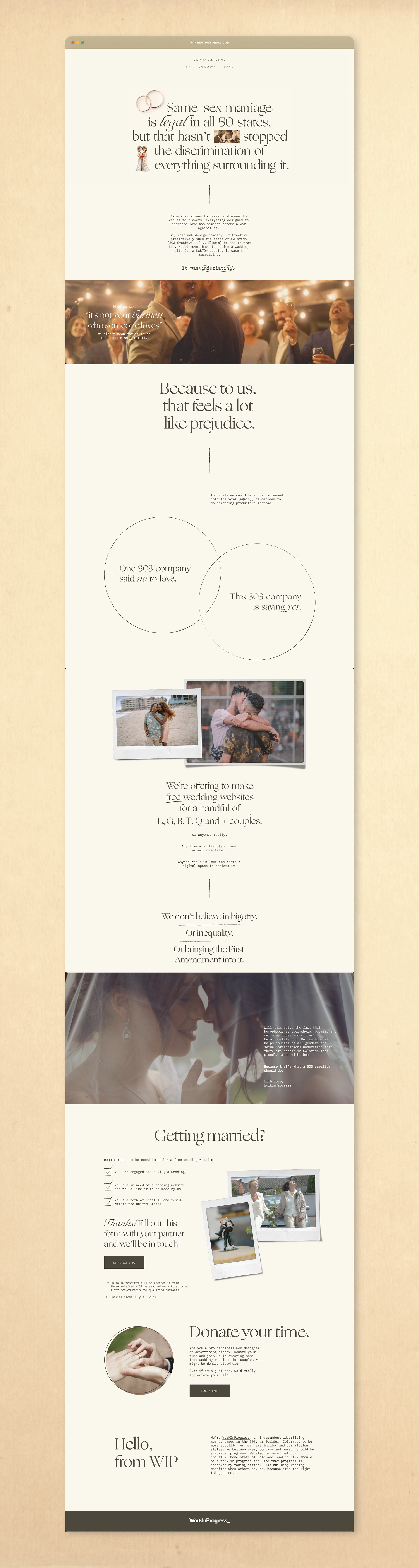 In response to a court case regarding a designer not wanting to offer their services to same-sex couples, we wanted to offer free wedding websites to all. The design is meant to evoke a sense of nostalgia, feeling similar to fliiping through an old wedding album. We bring in elements that feel hand-touched, such as the drawn lines and Polaroid frames. The soft texture and sepia tones create a warm and welcoming feel, creating a site that feels comfortable and accessible to couple of all orientations.