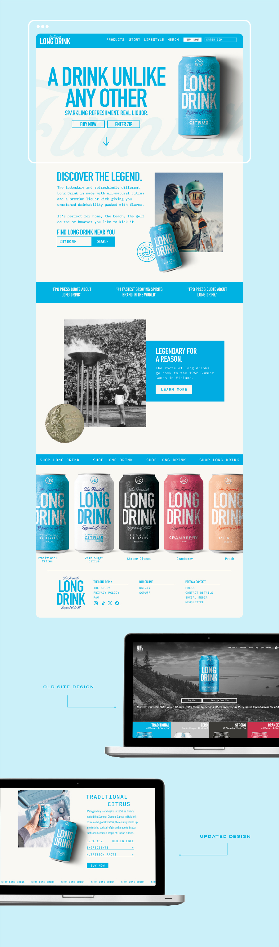Updating the website for The Finnish Long Drink to feel modern and fresh. Using a lighter color palette helped brighten up te site and feel friendlier and more approachable. Layering photography with product imagery creates depth and allows us to add visual interest.